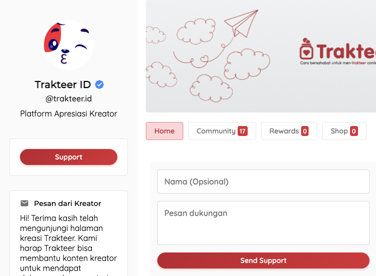 Buat halaman kreator unik yang bisa kamu atur sesuai identitasmu. Tambahkan banner, deskripsi, hingga konten penting agar suporter lebih mengenal karyamu.