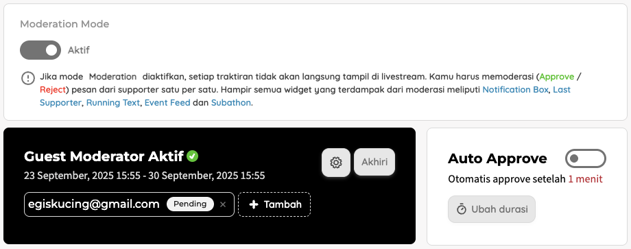 Filter pesan yang masuk agar lebih aman. Aktifkan Guest Moderation untuk membantu filter pesan dukungan. Aktifkan juga Auto-approve agar dukungan tayang otomatis.